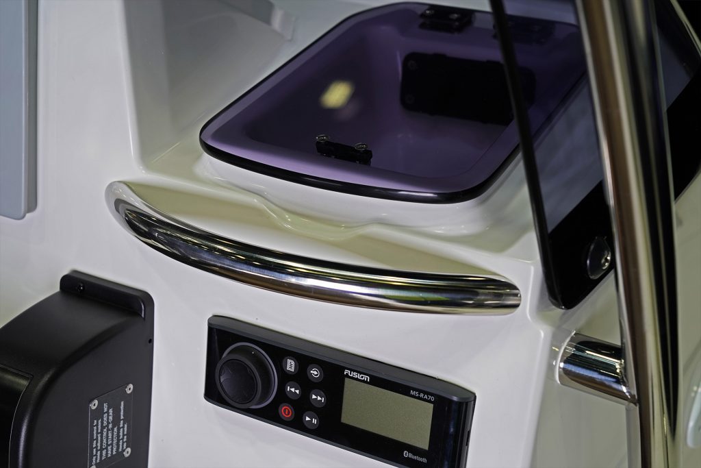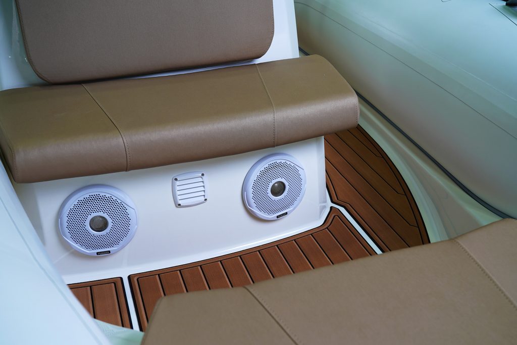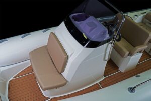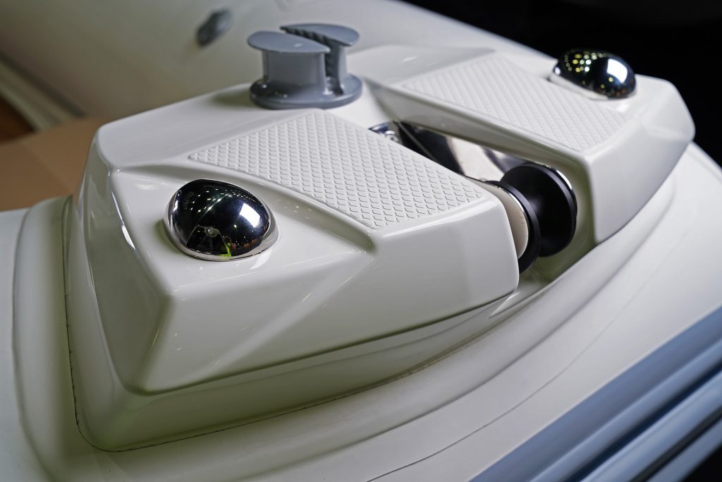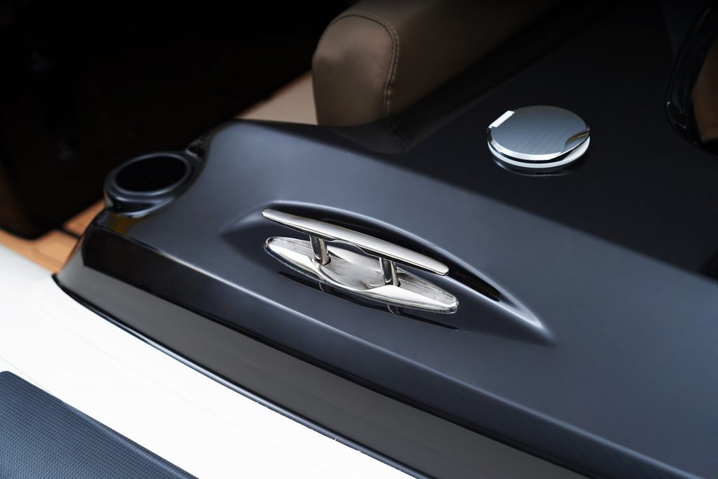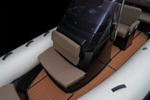 Sporty at heart but refined in detail, this RIB includes a central navigation mast that doubles as a ski tow post—perfect for wakeboarding or waterskiing on the fly. Anti-slip foot pads and thoughtfully placed grab rails enhance safety without compromising the boat’s sleek aesthetic.